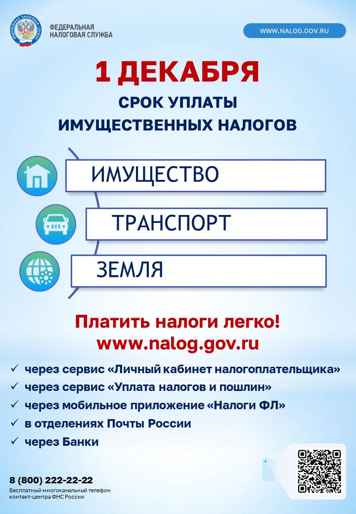 Напоминаем, что 1 декабря 2024 года истекает срок уплаты имущественных налогов!